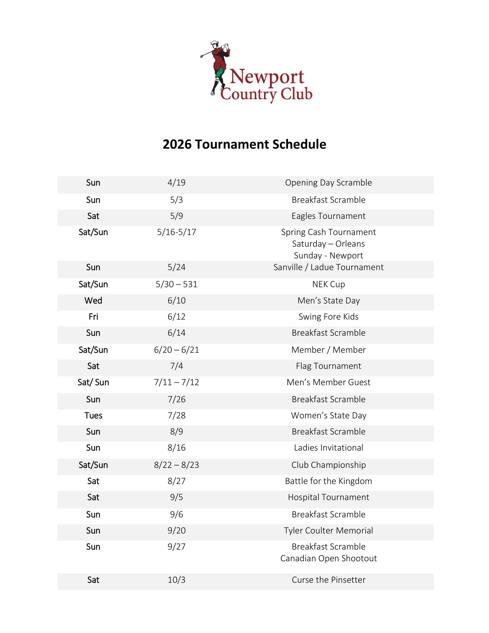 Ladies League 2026 Tournament Schedule at Newport Country Club Newport Country Club 590 Mount Vernon St Newport, VT 05855 Phone: 802.334.2391 Weather Forecast NEWPORT WEATHER